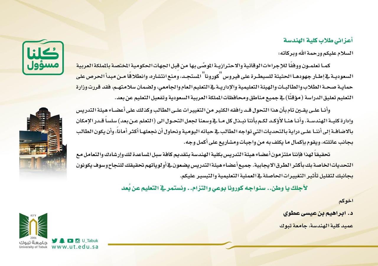 إعــلانـات تـبوگ V Twitter عميد كلية الهندسة بجامعة تبوك د إبراهيم بت عيسى عطوي في بث الروح لأبناءه الطلاب جميع أعضاء هيئة التدريس يضعون في أولوياتهم تحقيقك للنجاح وسوف