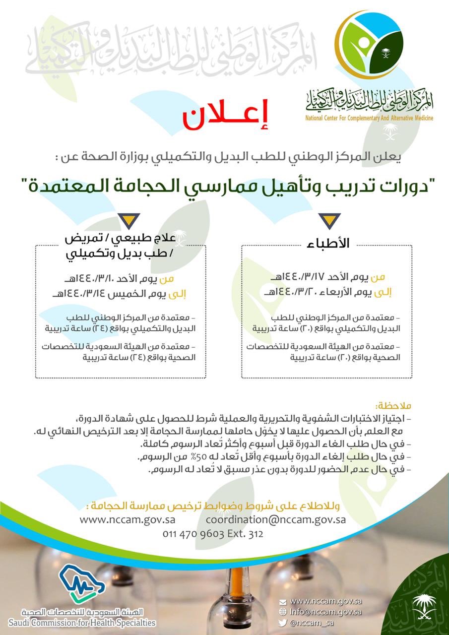 المركز الوطني للطب البديل والتكميلي A Twitter المركز يعلن عن دورات تدريب وتأهيل ممارسي الحجامة المعتمدة للأطباء والفئات الصحية المساعدة