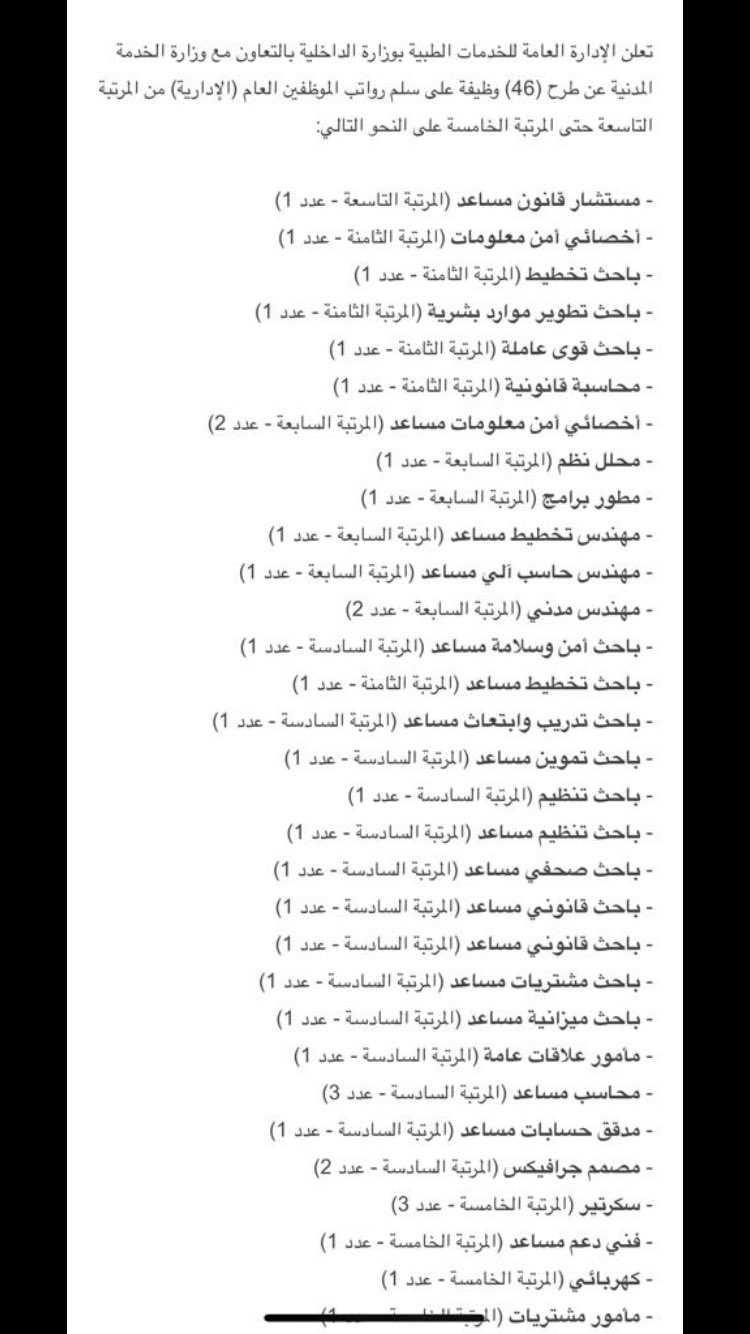 الخدمات الطبية بوزارة الداخلية On Twitter تعلن الإدارة العامة للخدمات الطبية بوزارة الداخلية عن طرح عدد من الوظائف الإدارية للرجال والنساء في سلم الموظفين العام في مدينة الرياض عن طريق موقع جدارة