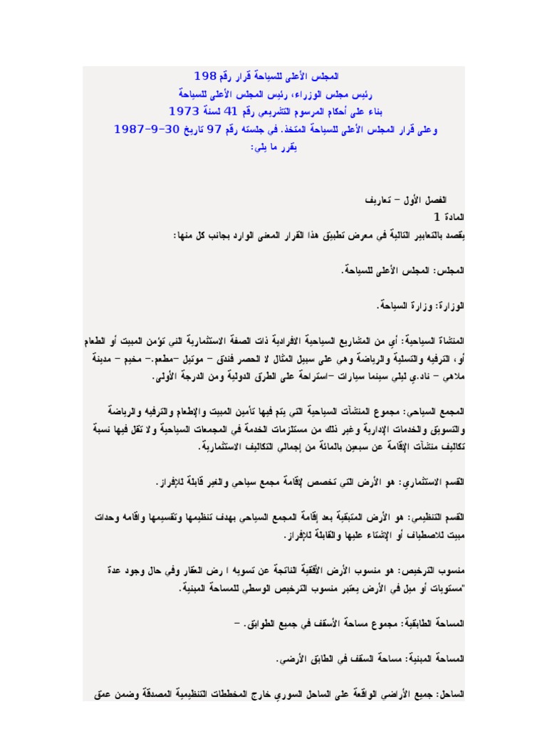 قرار رقم 198 شروط إقامة المجمعات والمنشآت السياحية السوري
