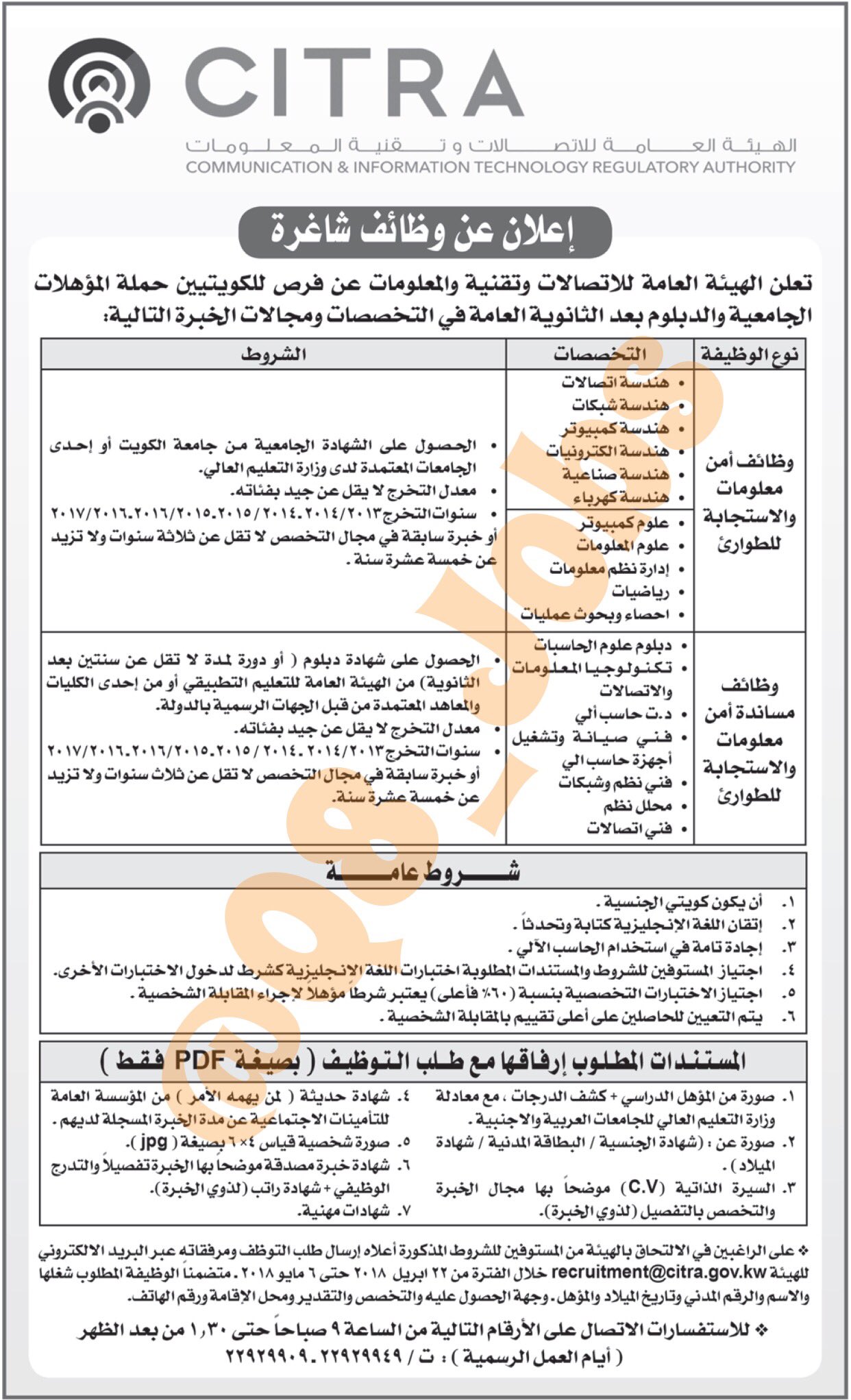 Jobs وظائف In Kuwait V Twitter الهيئة العامة للإتصالات و تقنية المعلومات تعلن حاجتها لعدد من الوظائف لحملة شهادة الدبلوم و البكالوريوس حديثي التخرج و ذو الخبرة لغاية 2018 5 6 Q8 Jobs Https T Co 8yynlwjhic